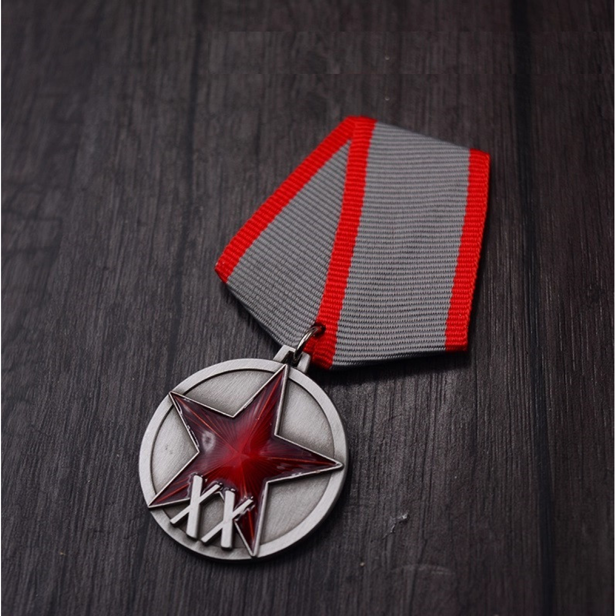 На лицьовій стороні в центрі розташована п“ятикутна зірка, покрита червоною емаллю, із золотими цифрами “XX“ у нижній частині.