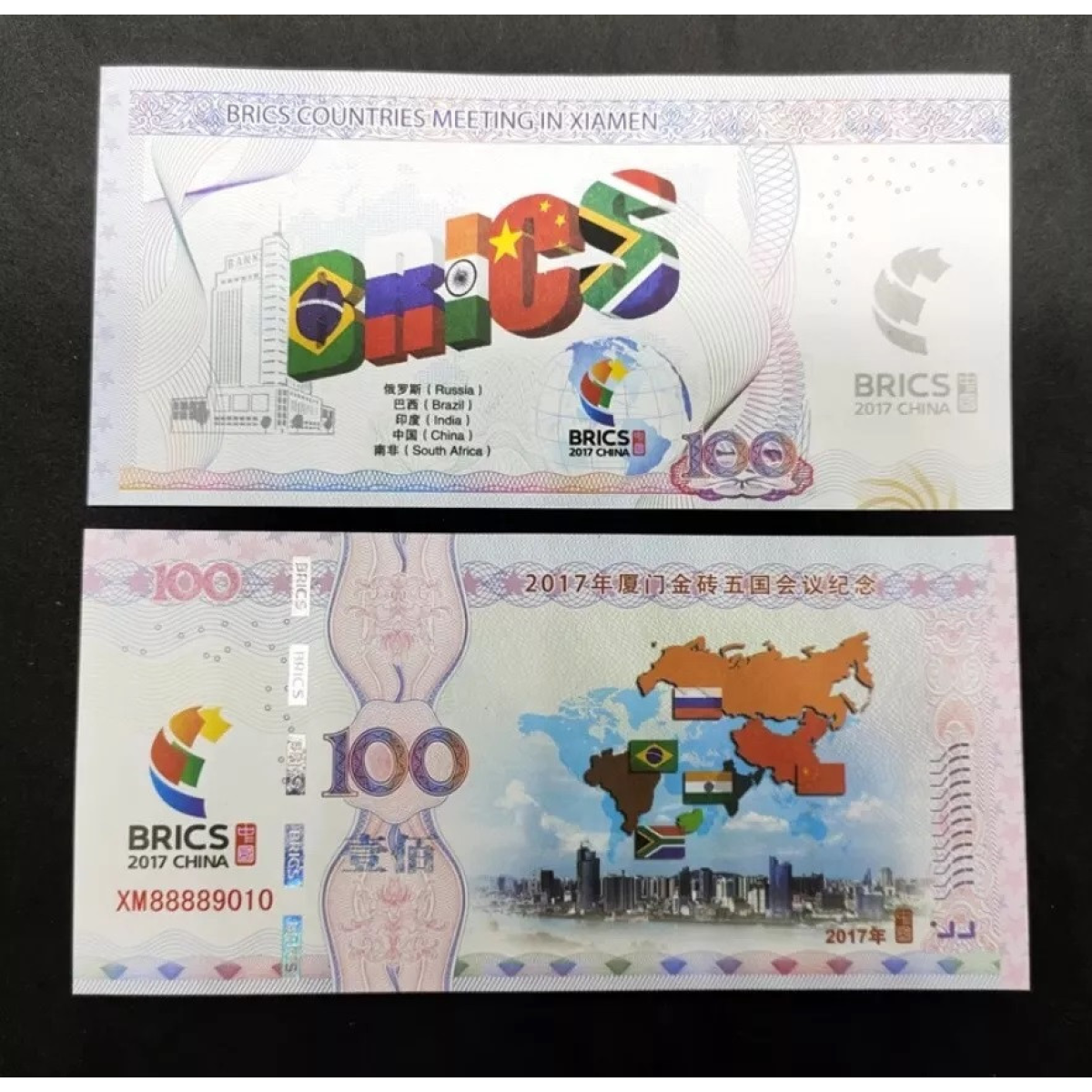 На зображенні представлена пам“ятна банкнота БРИКС 2017 року, випущена в Китаї на честь зустрічі країн БРІКС у САМені.