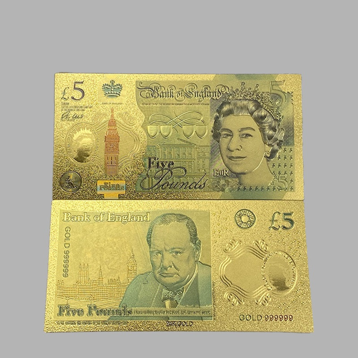 На зображенні представлена сувенірна банкнота номіналом 5 фунтів стерлінгів, виготовлена в золотому кольорі, із золотої фольги або з покриттям “під золото“.