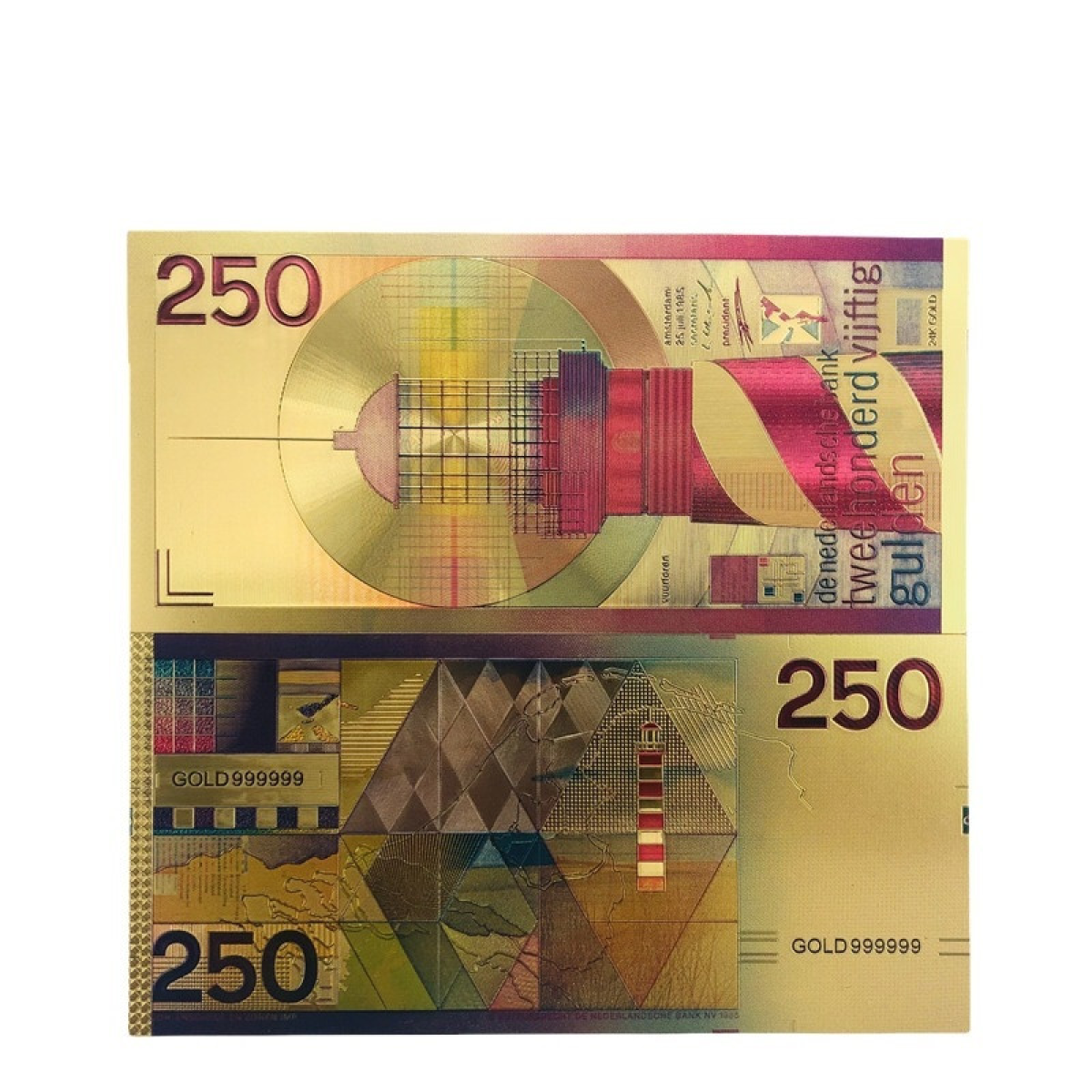На банкноті є написи на нідерландській мові, як-от “de nederlandsche bank“ (Нідерландинський банк) і “twee honderd vijftig gulden“ (двести п“ятдесят гульденів).