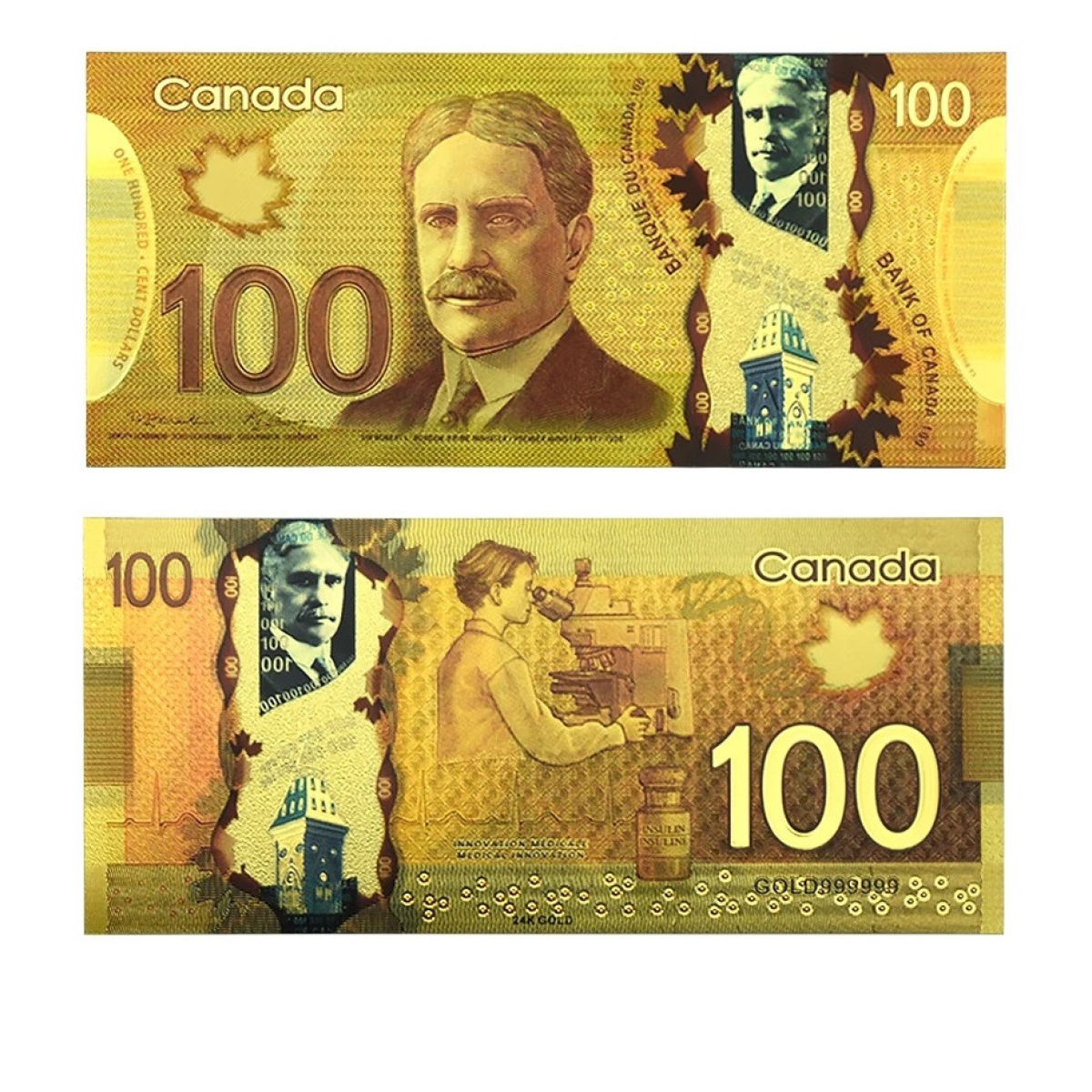 Є написи “INNOVATION MEDICALE“ і “MEDICAL INNOVATION“, а також “GOLD 999999“, що, ймовірно, вказує на колекційну або сувенірну природу цієї банкноти, оскільки справжні канадські долари не містять написів про золоті.