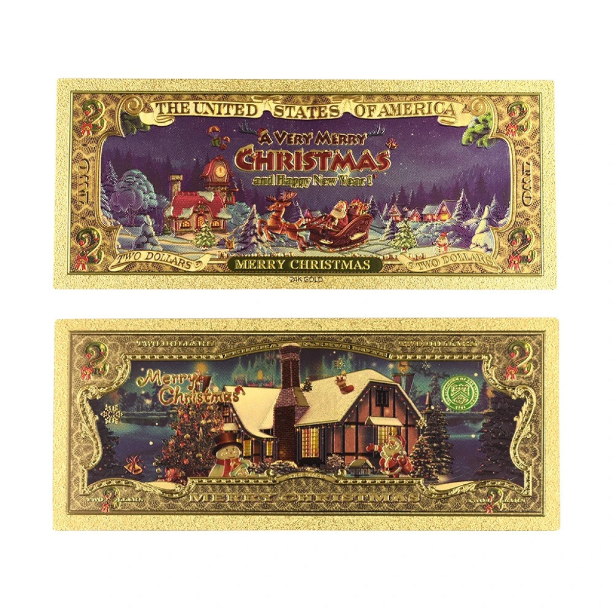 Обидві банкноти виготовлені в золотистому кольорі та мають написи “TWO DOLLARS“ і “Merry Christmas“, а також стилізовані елементи, характерні для банкнот США. У лівому верхньому кутку зображення видно логотип “WISHONCE“.