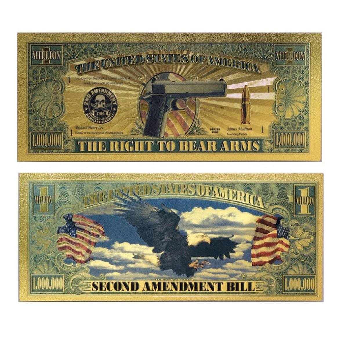 На верхній банкноті зображений пістолет, куля та емблема з написом “2ND AMENDMENT“, а також текст “THE RIGHT TO BEAR ARMS“ (навіть на носіння зброї) і “The right of the people to keep and bear arms, shall not be infringed“ (Пра народу зберігати та носити зброя не має порушуватися). Запам“ятовуються Річард Генрі Лі і Джеймс Медісон.
