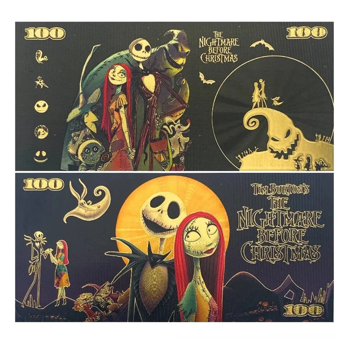 На зображенні представлені декоративні банкноти, виготовлена із золотої фольги, із зображенням персонажів мультфільму Disney «Кошмар перед Різдвом» Тіма Бертона «Кошмар перед Різдвом». із зображенням Джека Скелінгтона, Саллі Уги Буги Мен з Місячкою