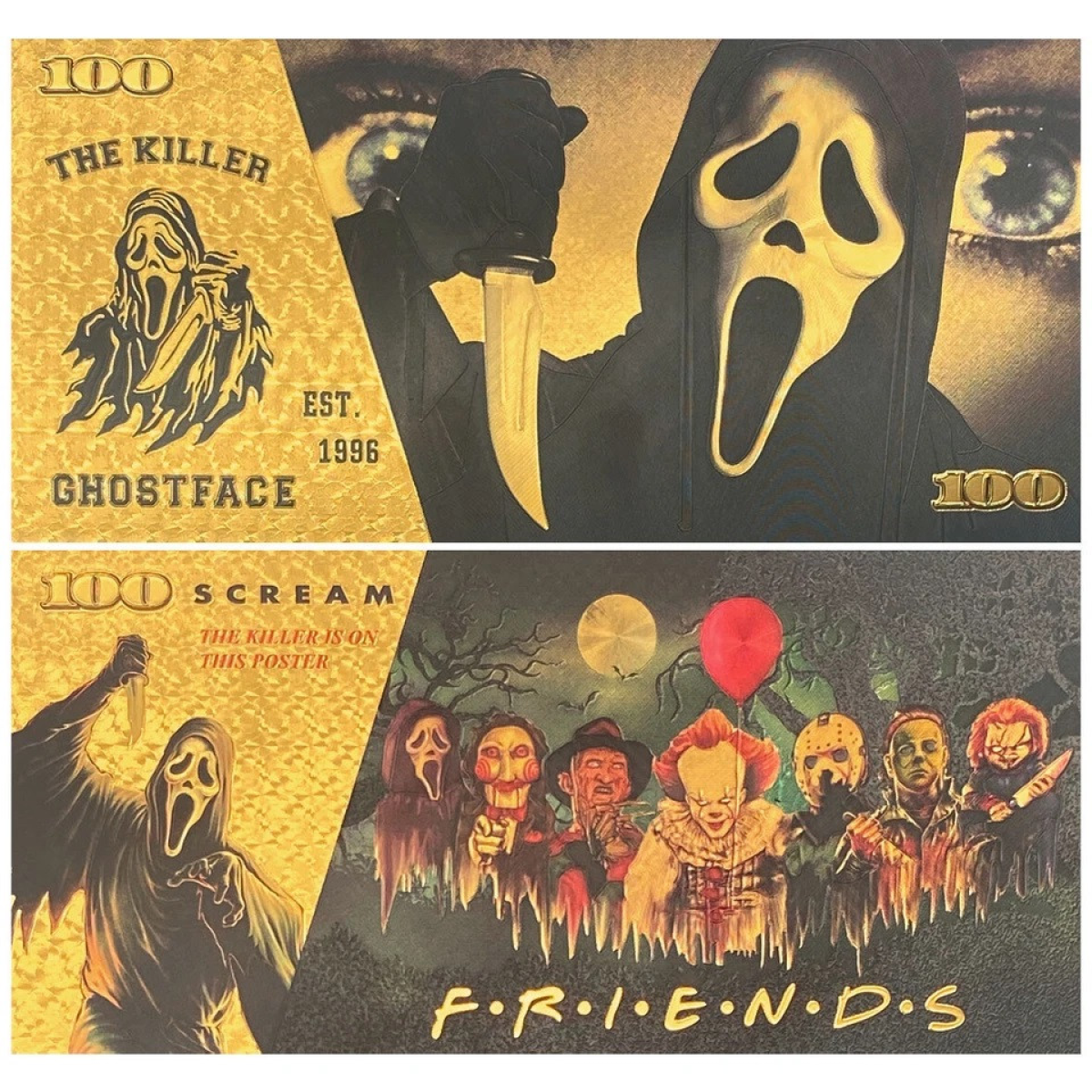 Золота банкнота із зображенням Примарного обличчя, що тримає ніж, і написами “100“, “THE KILLER“, “EST. 1996“, “GHOSTFACE“. Це позолочена фольгована банкнота 24K із зображенням Примарного обличчя з фільму “Крик“, виготовлена з високоякісного пластику.