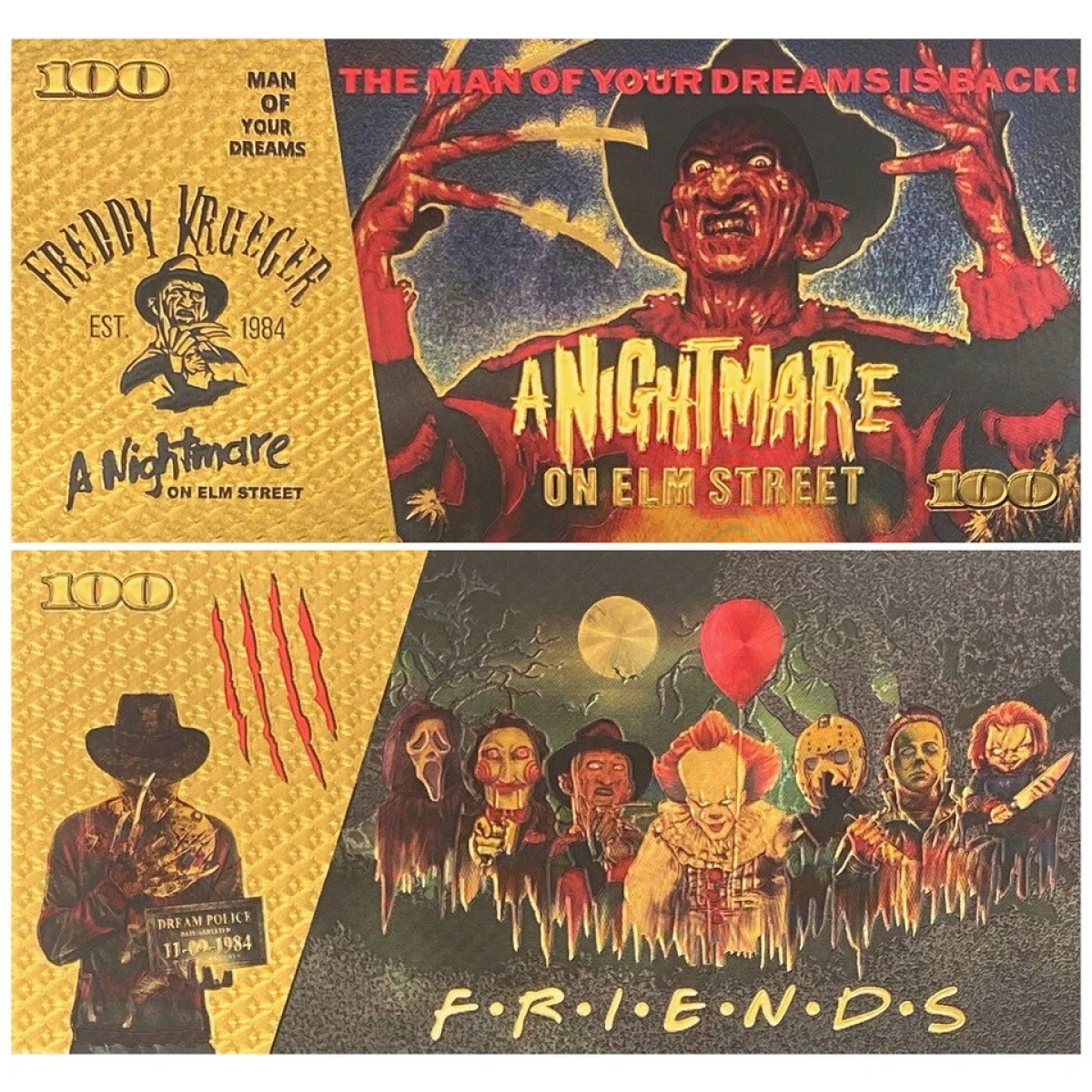 На зображенні представлена сувенірна банкнота, стилізована під 100-доларову купюру, присвячена Фредді Крюгеру та фільму “Кошмар на вулиці В“язів“.