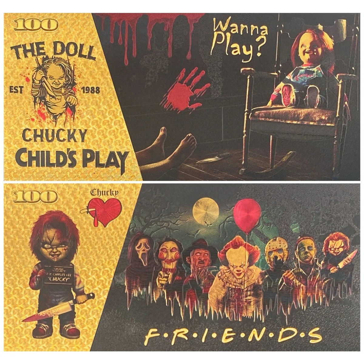 На зображенні представлена сувенірна банкнота, стилізована під 100-доларову купюру, присвячена фільму жахів “Дитячі ігри“ (Child“s Play) і її головному антагоністу — ляльці Чакі.