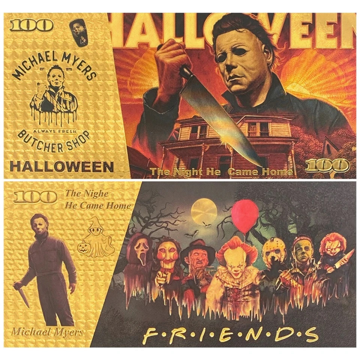 На зображенні представлені сувенірні банкноти, стилізовані під грошові купюри, з тематикою фільмів жахів: