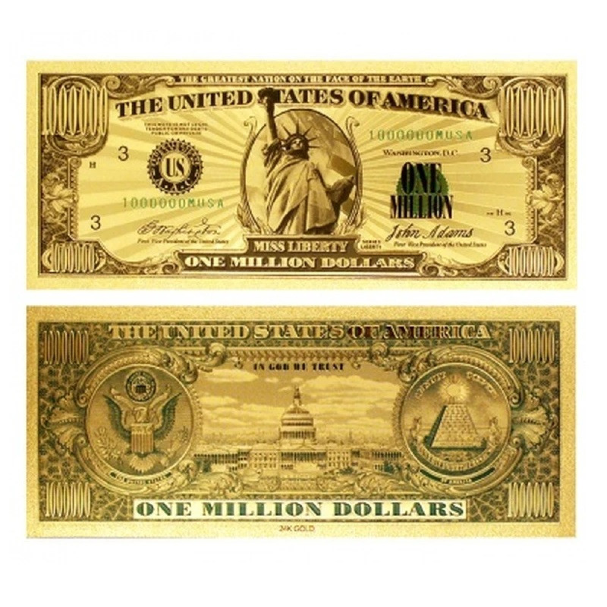 Лицьовий бік: Зображення Статуї Свободи, номінал “ONE MILLION DOLLARS“ і напис “THE UNITED STATES OF AMERICA“.