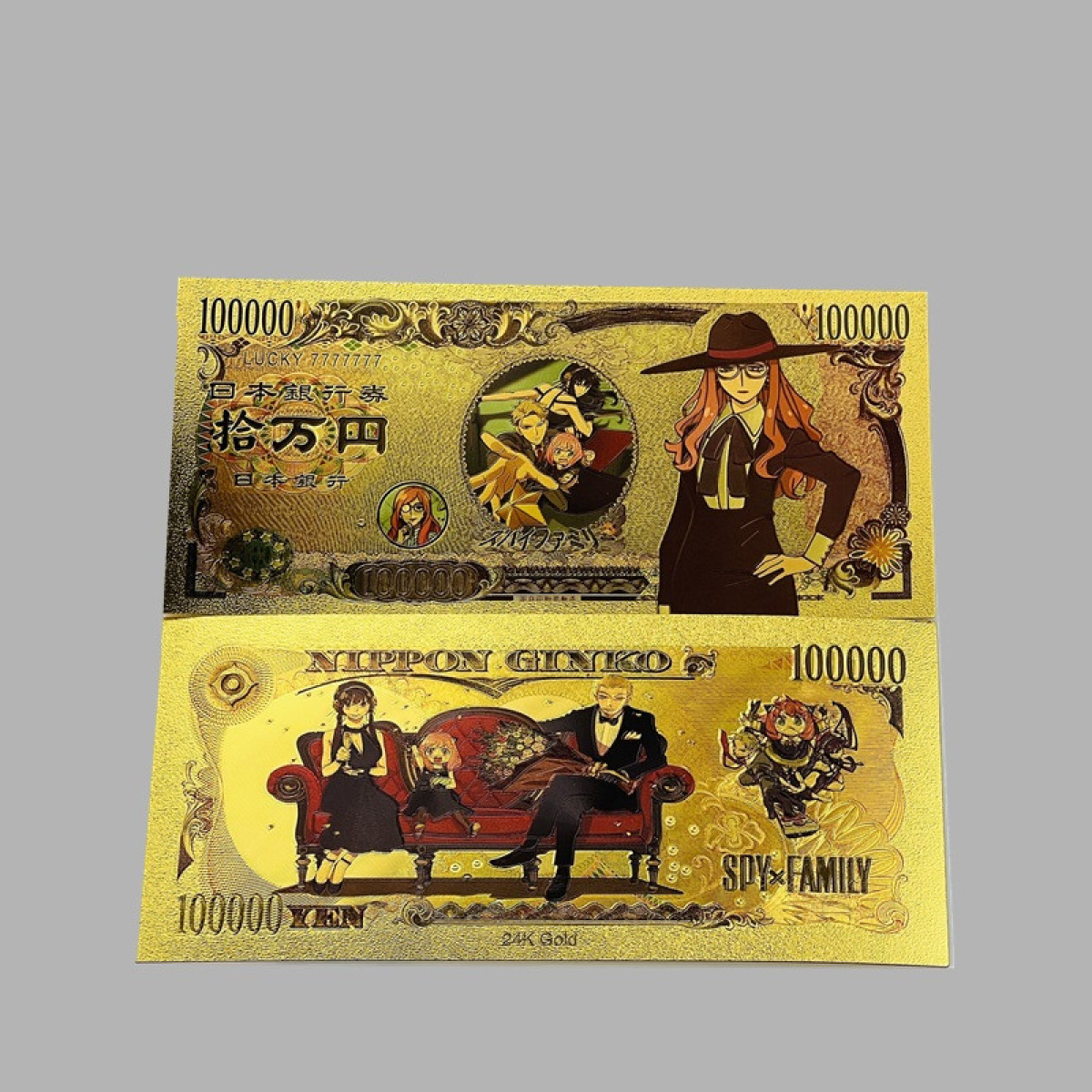 На зображенні представлена сувенірна банкнота номіналом 100 000 єн, присвячена аніме “Сім“я шпигуна“ (Spy x Family).