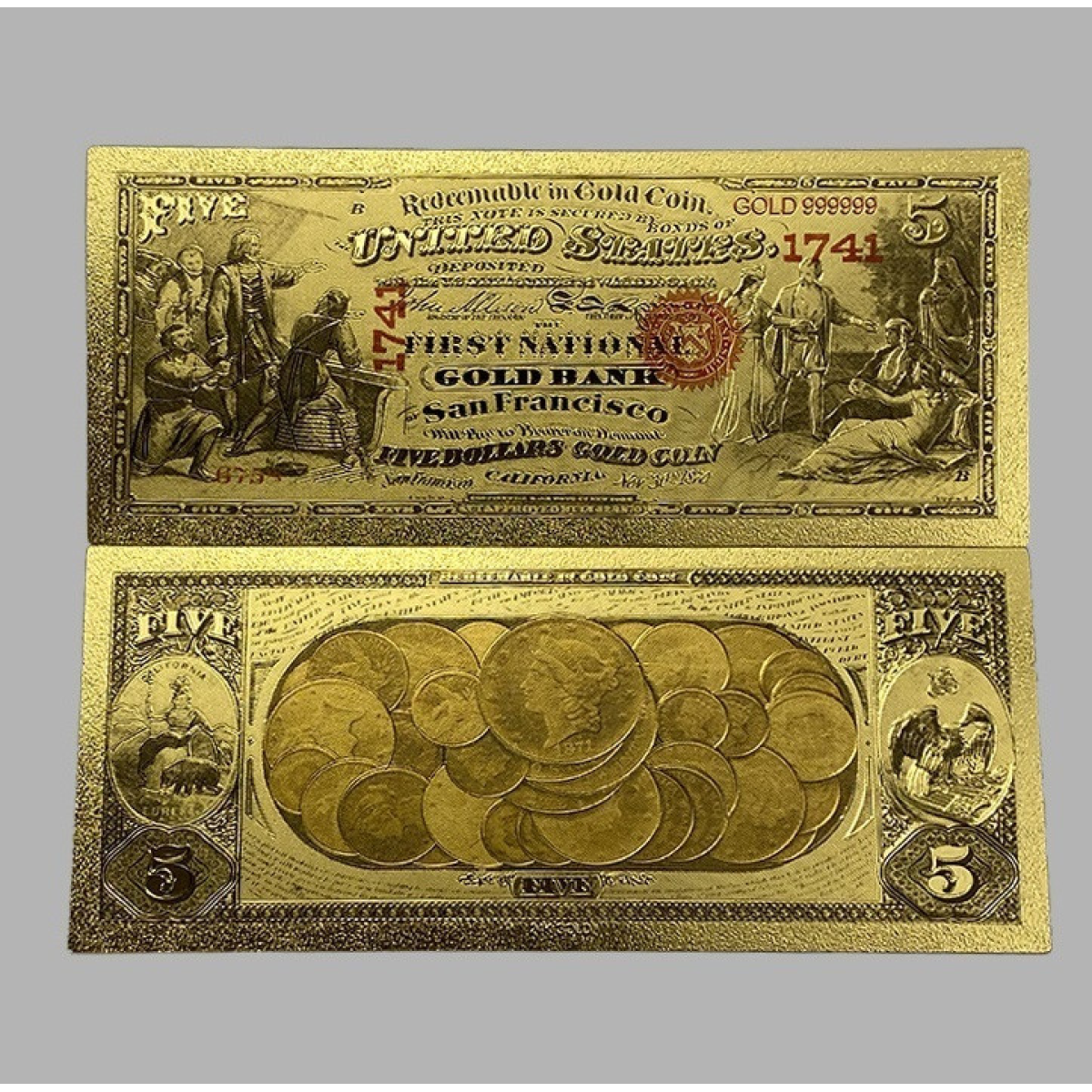 Зворотний бік (реверс): Залежно від конкретного випуску банкноти 1875 року, на реверсі могли бути зображення американського моста або будівліпоряду США. Додаткові деталі: напис “THE UNITED STATES OFAMERICA WILL PAY TO THE BEARER ON DEMAND“, цифра “5“, а також написи “SERIES OF“ і дата.