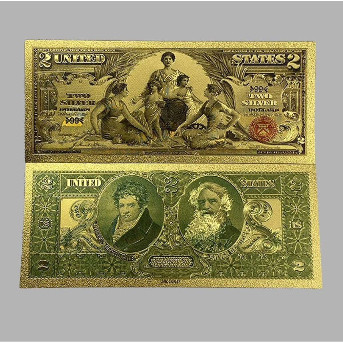 Банкнота номіналом 2 долари, випущена у 1896 році, має на лицьовій стороні зображення жінки — Капітольської богині свободи (Stature of Liberty) на тлігурського страшства. Ця купюра відома як «Дводоларна срібна сертифікація», є рідкісною і цінною колекційною рідкістю, на якій немає зображення відомої історичної особистості, як на пізніших випусках банкнот 298, де зображений Томас Джефферсон.