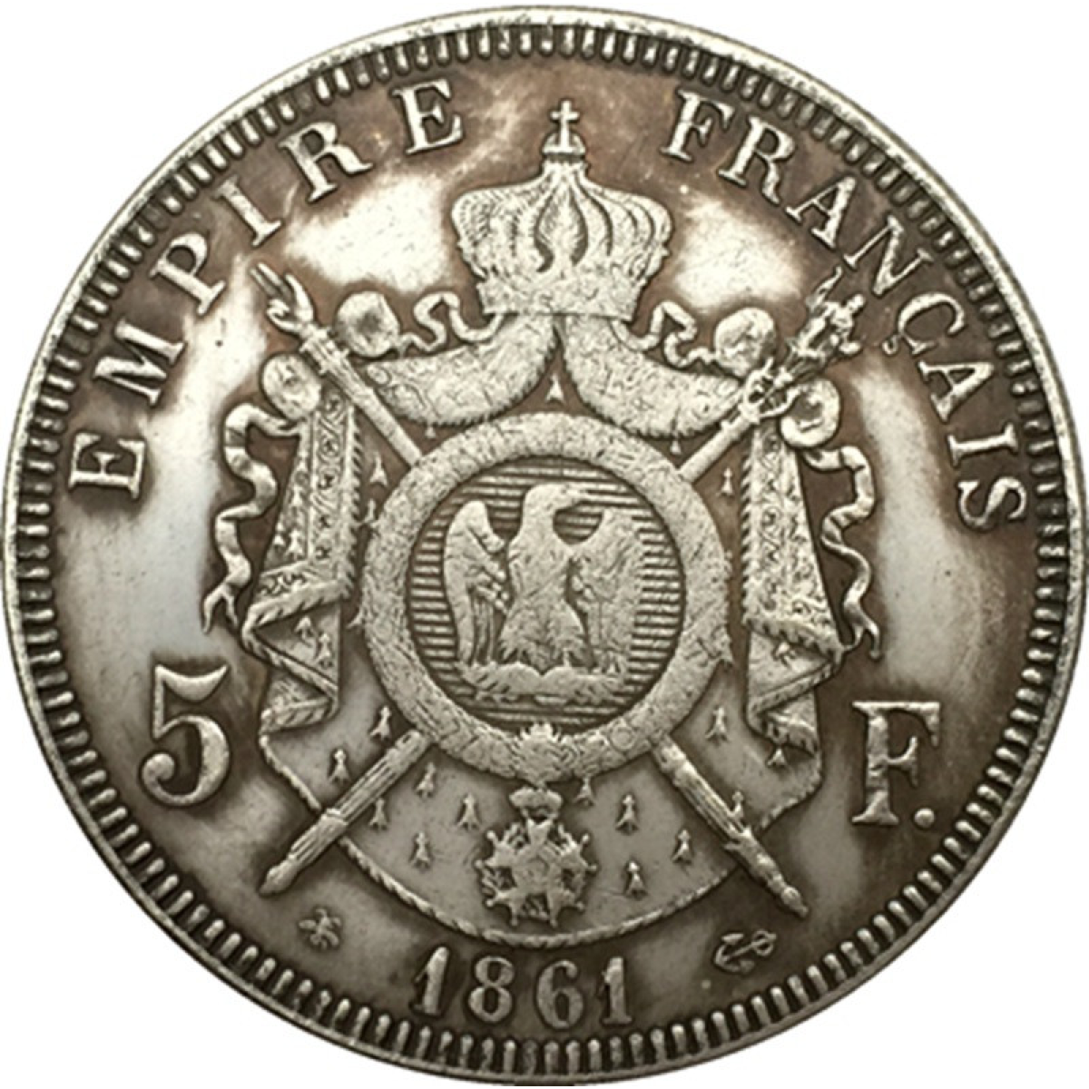 На зображенні представлена монета 5 пива Наполеона III з лавровим вінком, випущена у Франції 1861 року.