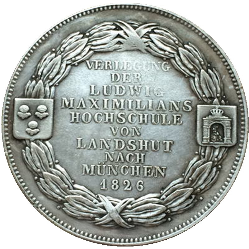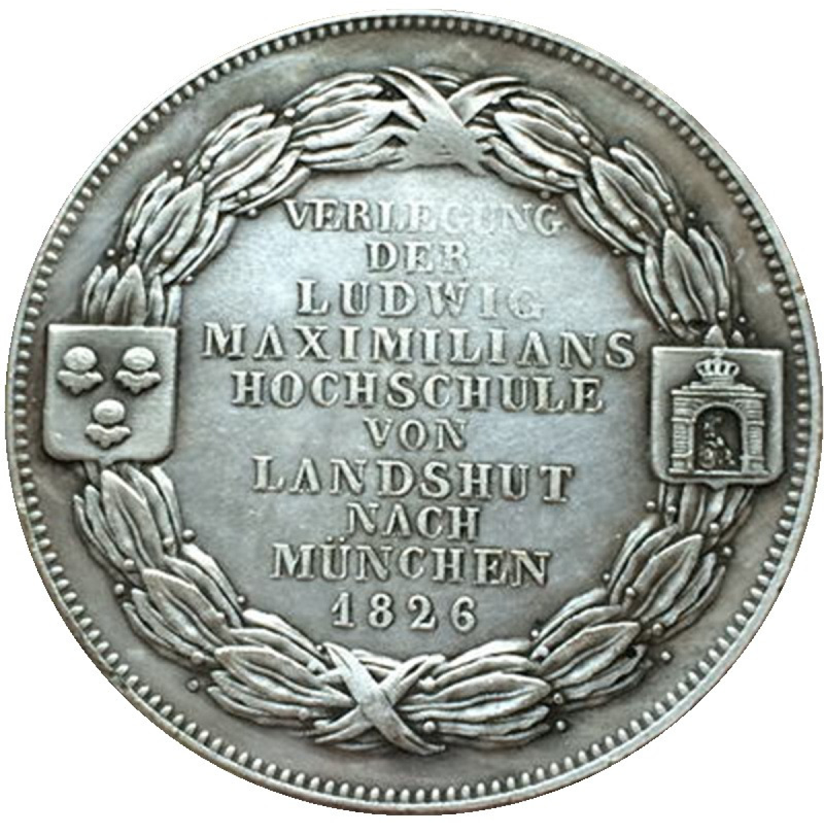 Напис: У центрі монети розміщений напис “VERLEGUNG DER LUDWIG MAXIMILIANS HOCHSCHULE VON LANDSHUT NACH MUNCHEN 1826“, що перекладається як “Перевод Університету Людвіга Максиміліана з Ландсхуту в Мюнхів 1826“.