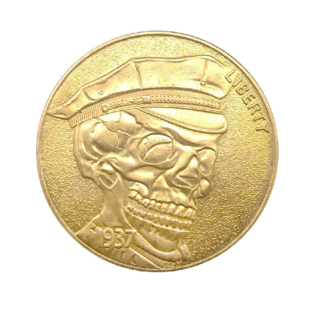 Монета на зображенні — це хобо-нікель (Hobo Nickel), або, у цьому разі, його сучасна інтерпретація, що ґрунтується на дизайні 1937 року. Це різальна монета, на якій зображений череп у кашкеті, що схожий на кашкет таксіста або кондуктора, з написом “LIBERTY“ і роком “1937“.