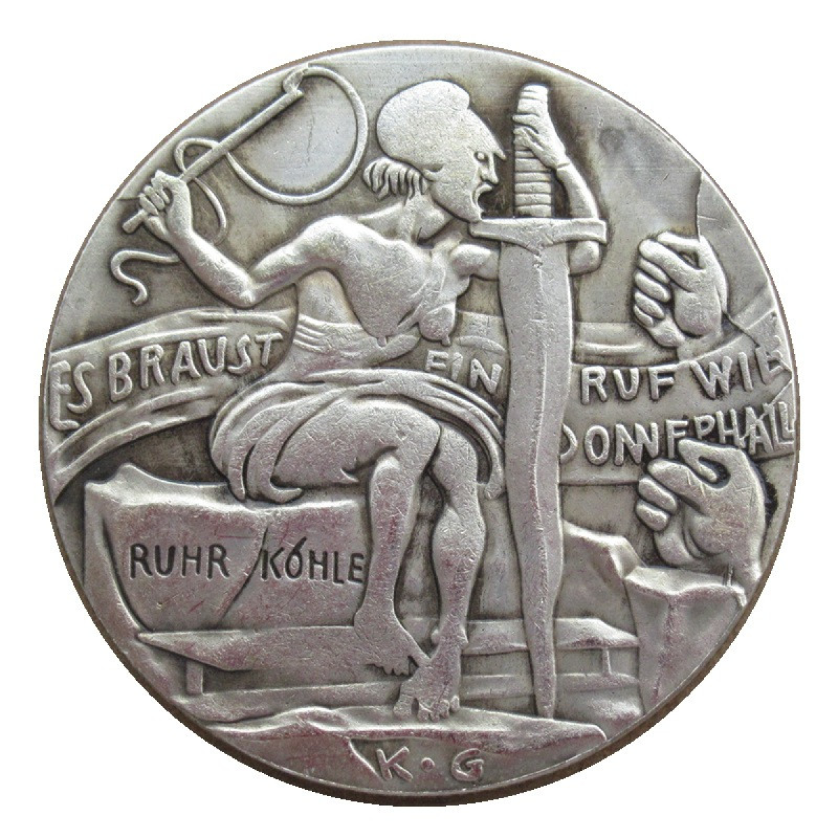 Лицьовий бік: Сцену суда над розбійниками, де фігура в центрі, ймовірно, символізує справедливість, оточену зброєю й іншими елементами, пов“язаними зі розбійниками. Написи на меалі містять “DER RÄUBERGERICHTSHOF IN MAINZ“ (Суд розбійників у Майнці) і рік “1923“.
