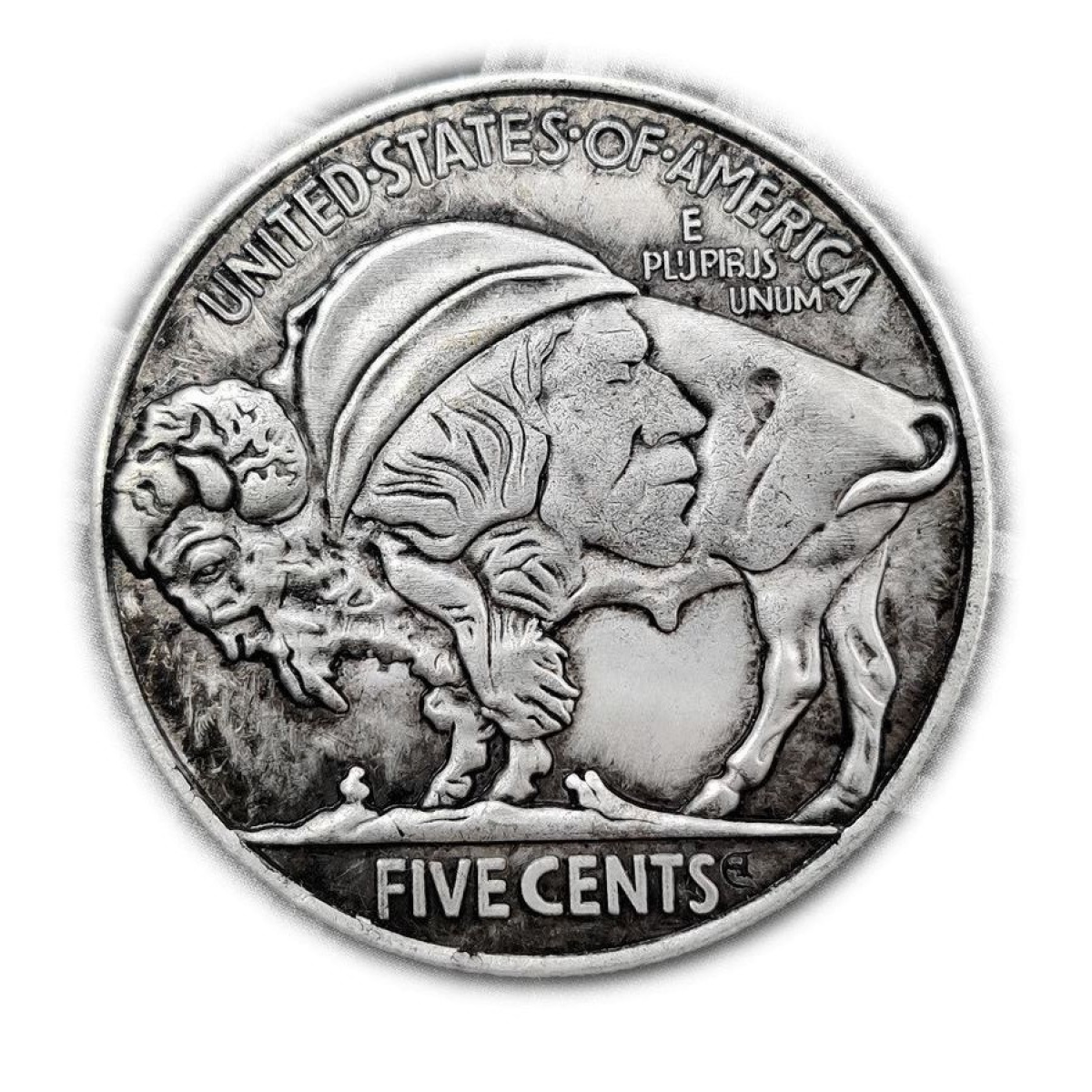 На зображенні представлена американська монета США номіналом п“ять міліграмів, відома як «Баффало Нікель» (Buffalo Nickel) або «Індеєць і бізон» (Indian Head Nickel).