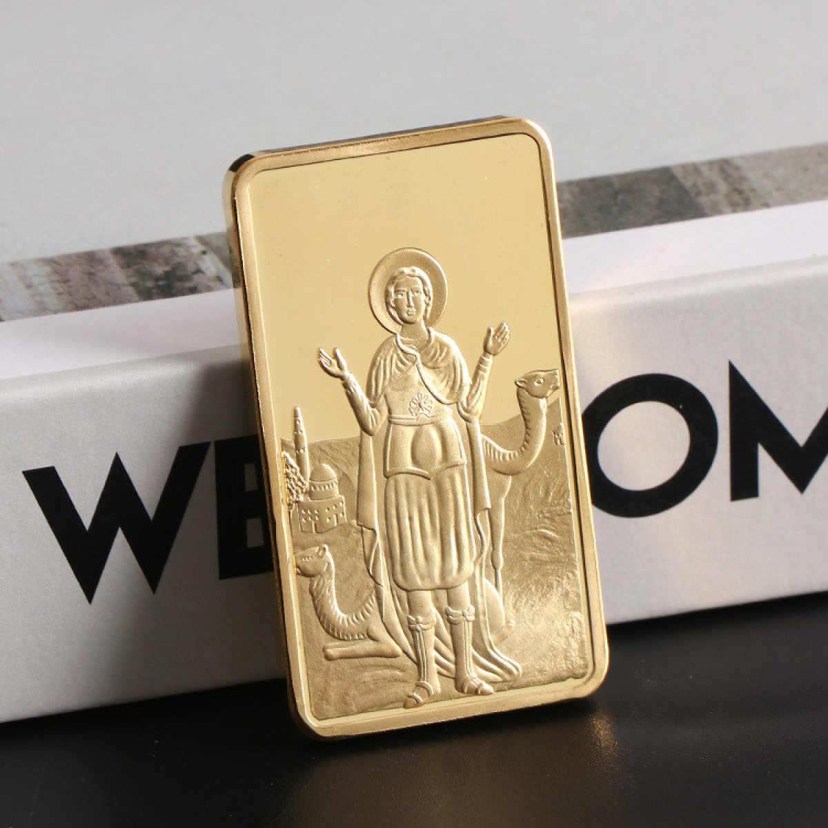 Сувенір позолочена монета слиток, канонічне зображення Святого Міні. 50 x 28 mm