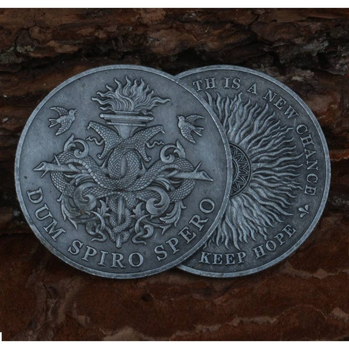 Монета на зображенні — це монета “Dum Spiro Spero“, також відома як “Stoic Coin“ або “EDC Reminder Coin“.