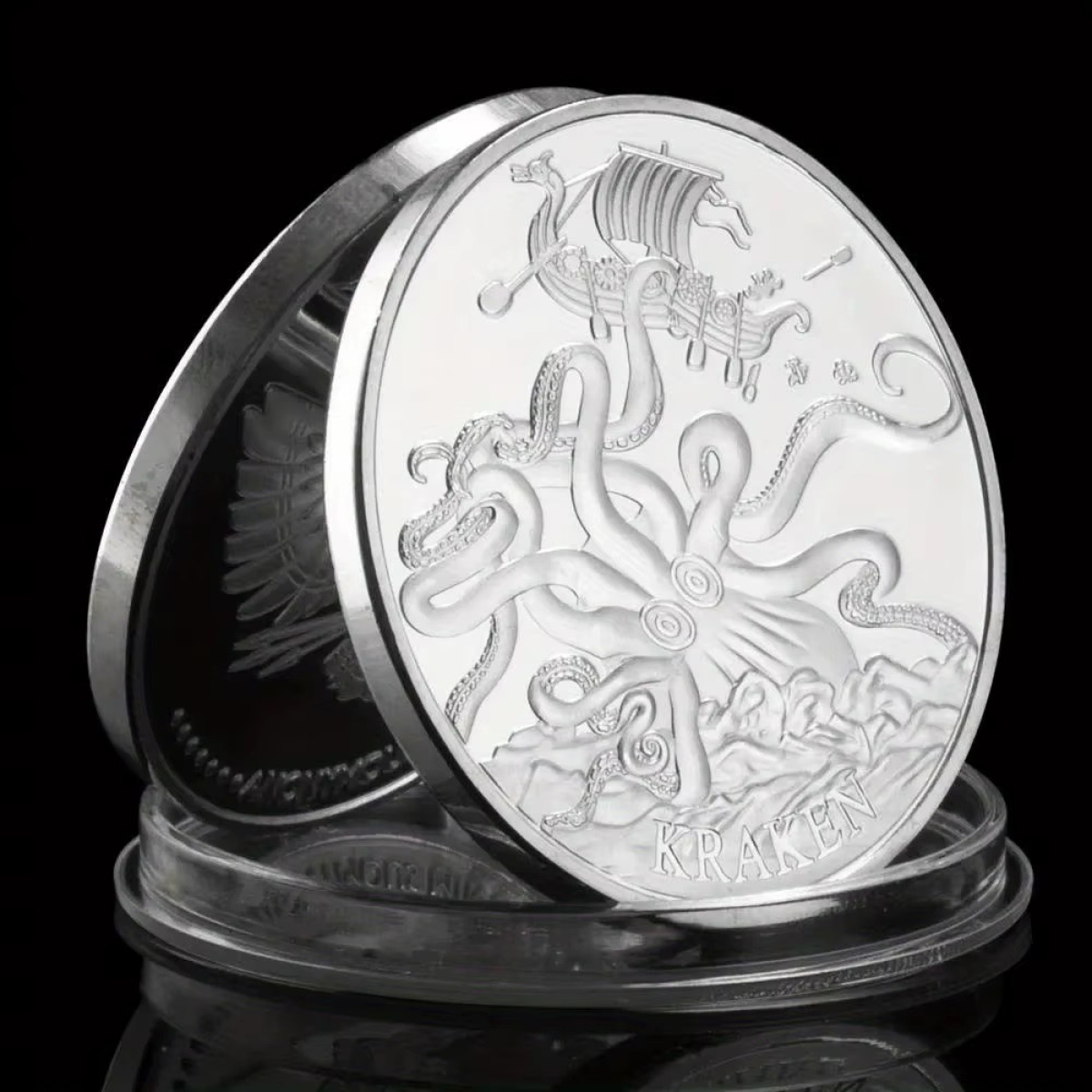 Аверс: Зображений Кракен — міфічне морське чудовисько, що мешкає в глибинах океану, часто описане як гігантський кальмар або восьминіг. Під зображенням Кракена вигравіюване слово “KRAKEN“.