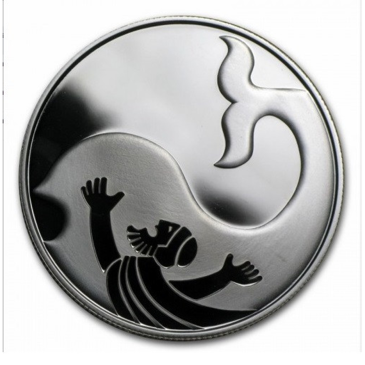 Зображення: На монеті видно стилізоване зображення кита, з пащі якого виходить або в якого входить людина (Іона). Дизайн виготовлений у контрастних кольорах або з використанням різних текстур, створюючи ефект рельєфу та глибини.