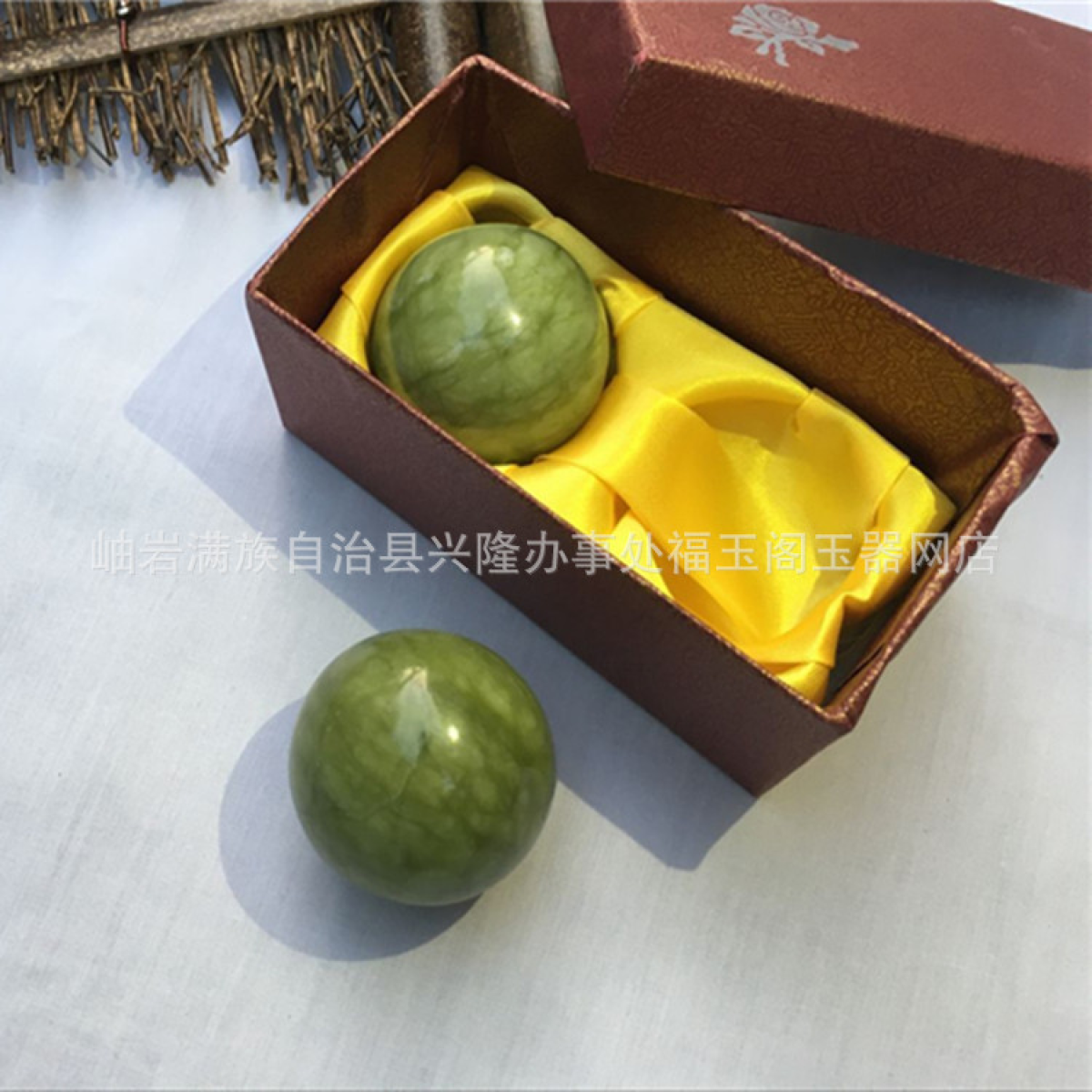 На зображенні представлені нефритові масажні кульки Баодинга в подарунковому пакованні.
