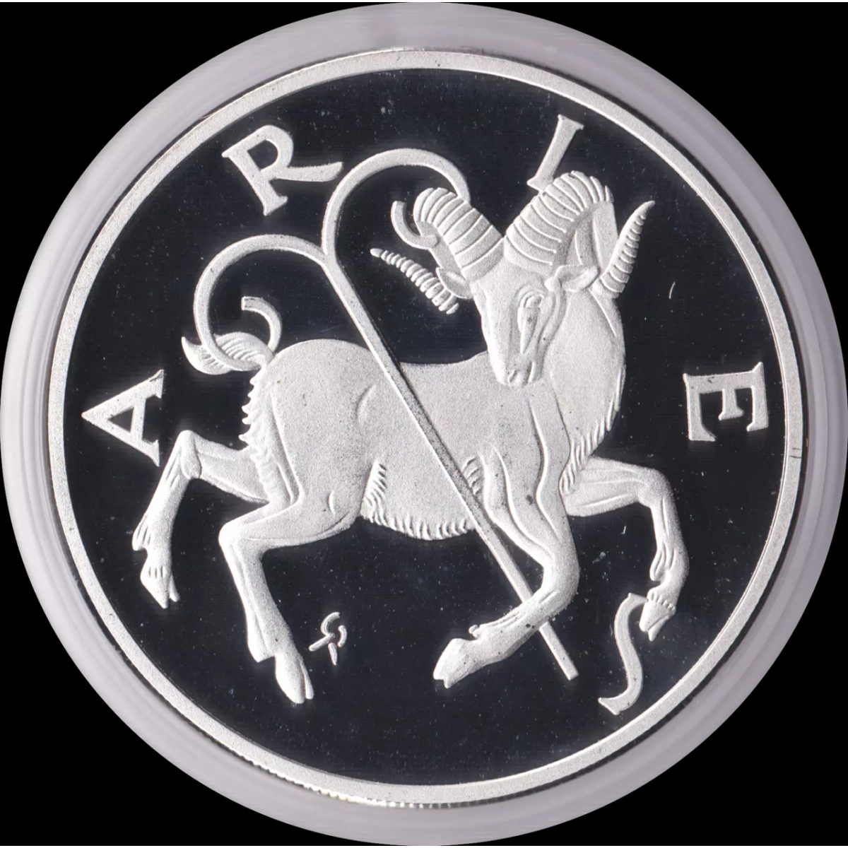 Написи: По краю монети частково видно напис “ARIES“, що відповідає знаку зодіаку Овен латині.