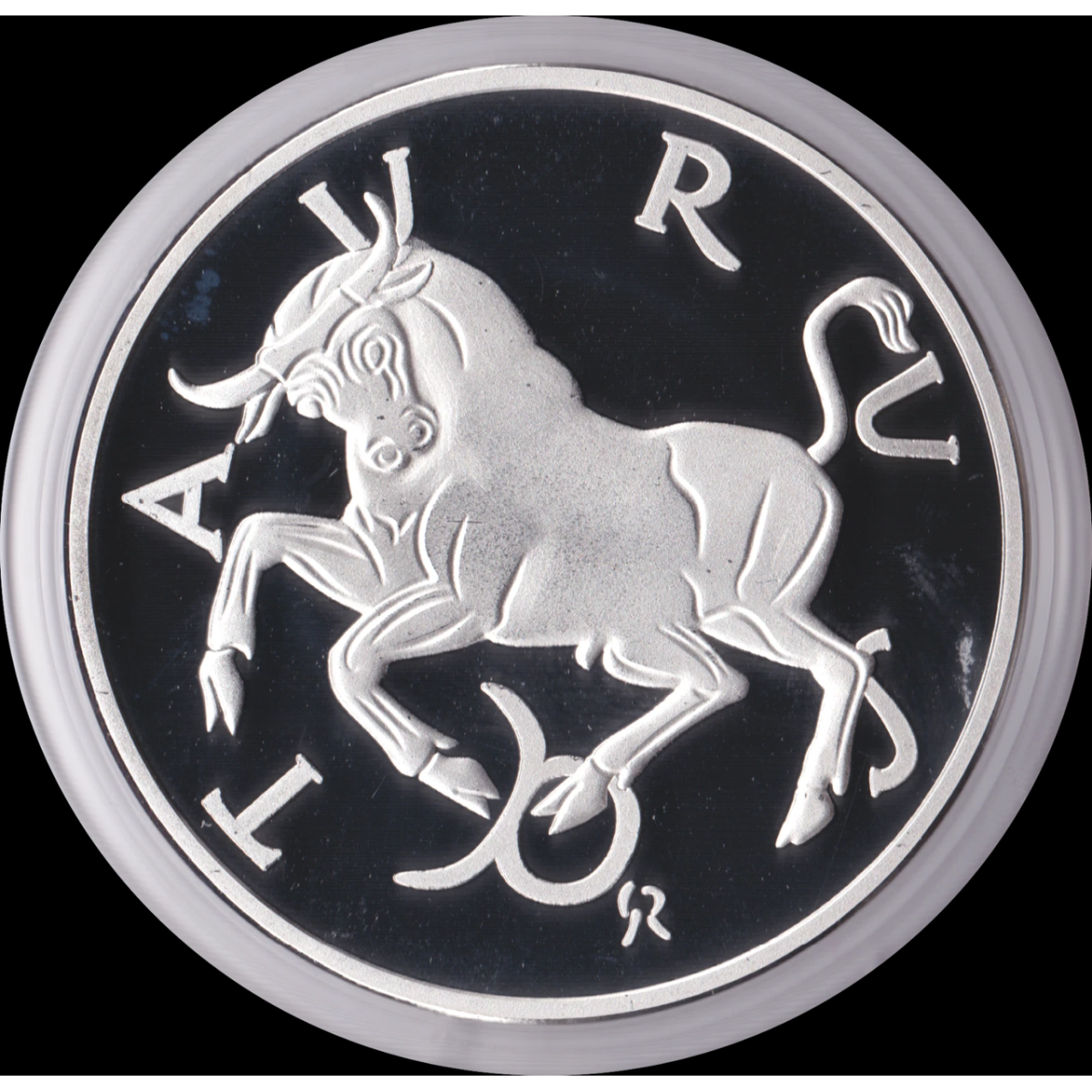 Срібна медаль Телец «Скарбниця Зодіака» Гілроя Робертса (Монетне подвір“я Франкліна, 1970 р.) ~ 26,5 грамів Перша серія «Зодіак» Монетного двору Франкліна та перша повна серія, коли-небудь створена Гілроєм Робертсом, який розробив нову концепцію дизайну Зодіаку, переплітаючи знак, символ і слово в художній гармонії. Медаль розміром 39 міліметрів має маркування на ребрі «STERLING»