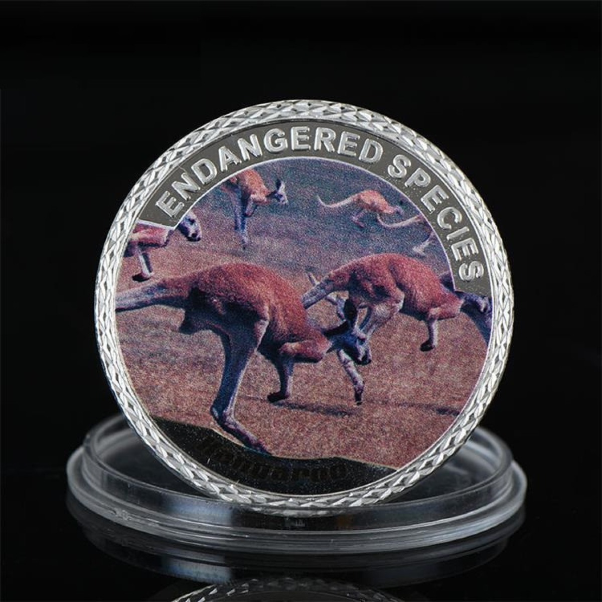 Аверс монети (бічна з кенгуру): На цій стороні зображений кенгуру, імовірно, у природному середовищі проживання, з написом “Kangaroo“ і “ENDANGERED SPECIES“ (Існтичні різновиди).