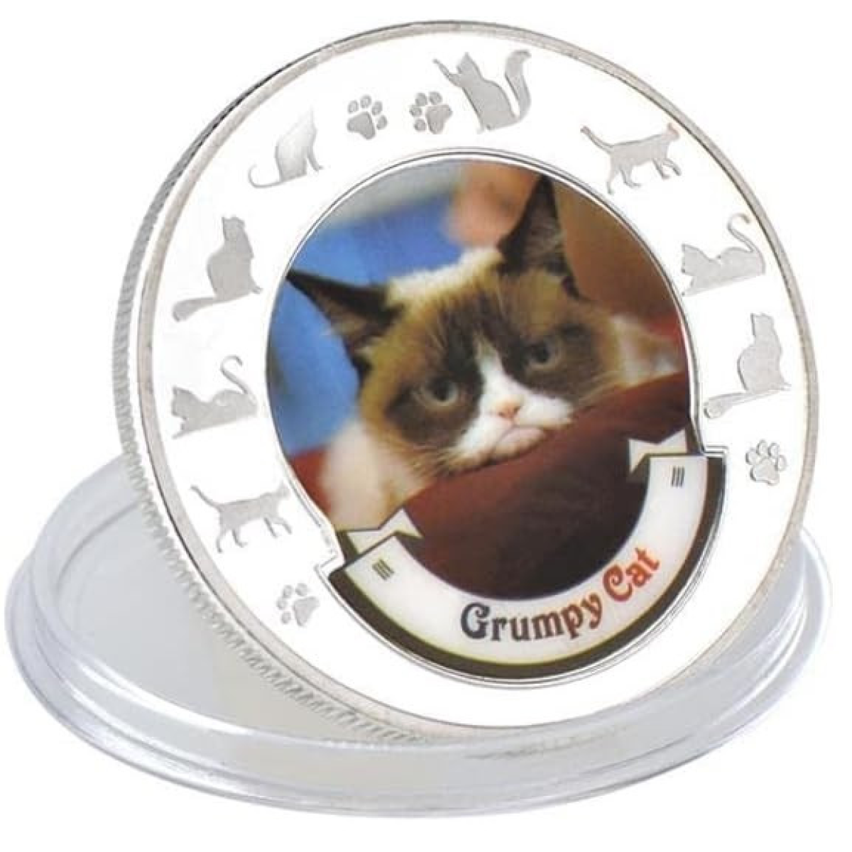 На зображенні представлена пам“ятна монета, присвячена інтернет-знаменистості Grumpy Cat (Сердитий Кіт). (справжнє ім“я Соус Тардар)