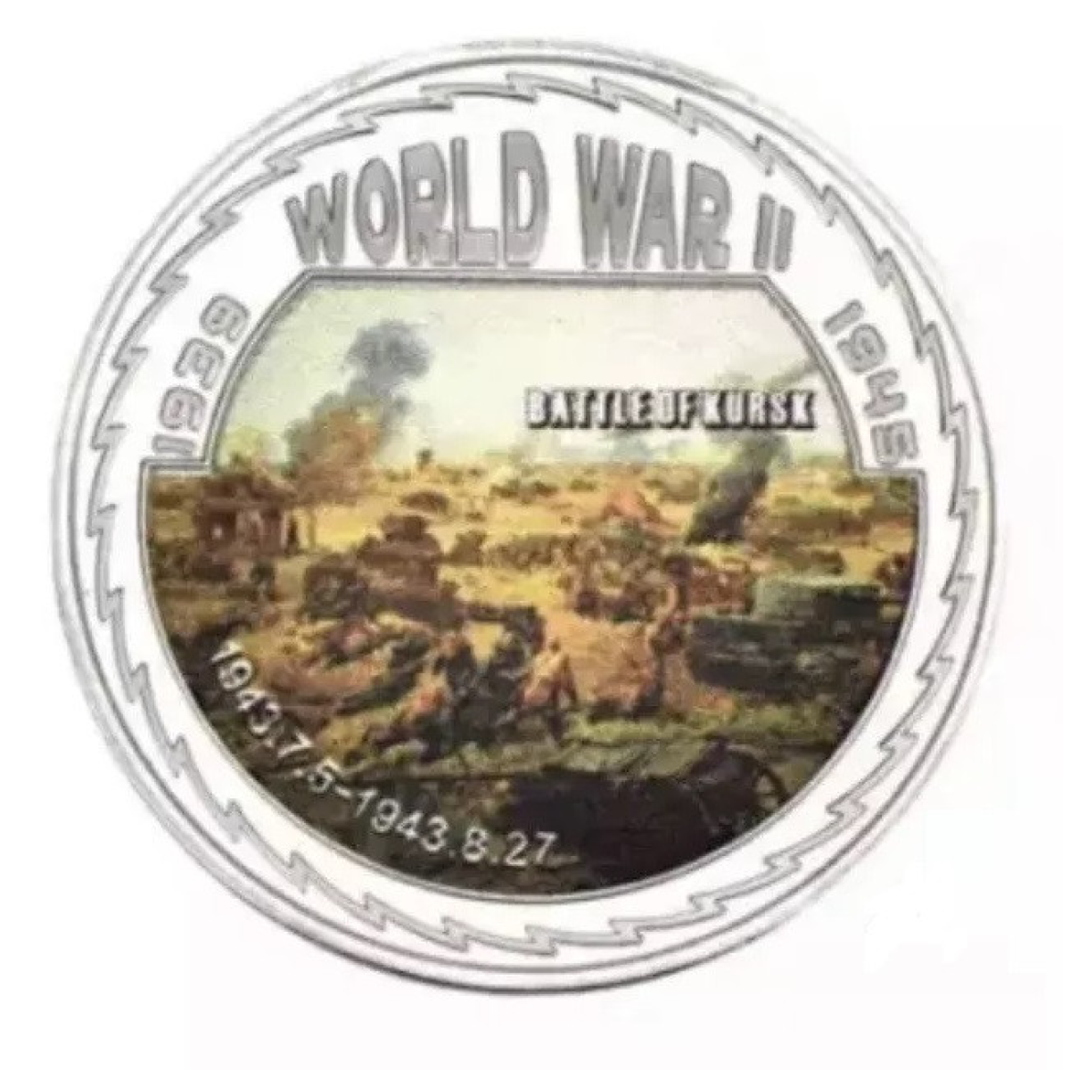 Аверс: Зображення сцени з Битви на Курській дузі з написами “WORLD WAR II“ (Втора світова війна), “BATTLE OF KURSK“ (Битва на Курській дузі) і датами битви “1943.7.5-1943.8.27“ (5 липня — 27 серпня 1943 року), а також роками війни “1939“ і “1945“.