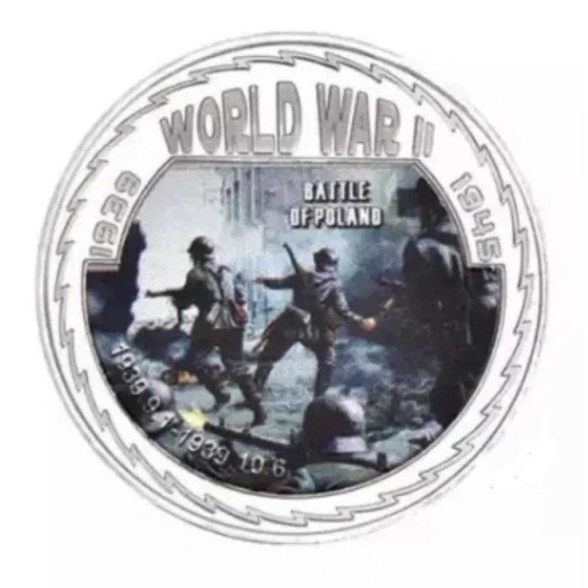 Тематика: Кожна монета присвячена певній події або битві Другої світової війни, про що свідчать написи “WORLD WAR II“ і назви битв, як-от “BATTLE OF POLAND“, “NORMANDY LANDING“, “BATTLE OF MIDWAY“, “BATTLE OF KURSK“, “BATTLE OF THE ATLANTIC“.