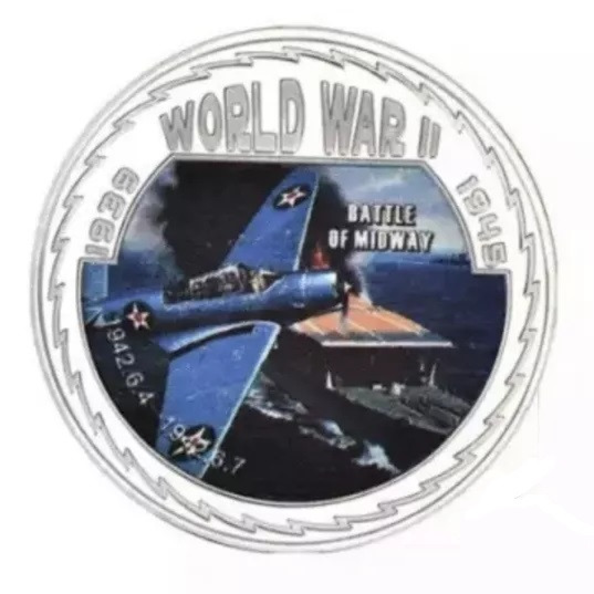 Реверс (перевертна сторона): На реверсі монети зображена сцена “Битви за Мідуей“ (BATTLE OF MIDWAY), ключової морської битви Другої світової війни на Тихоокеанському театрі воєнних дій. Видно літак, ймовірно, бере участь у битві. Також є написи “WORLD WAR II“ (Подруга світова війна) і дати, пов“язані з бітвою: “1942.6.4“ і “1942.6.7“, що позначають дати початку та закінчення битви.