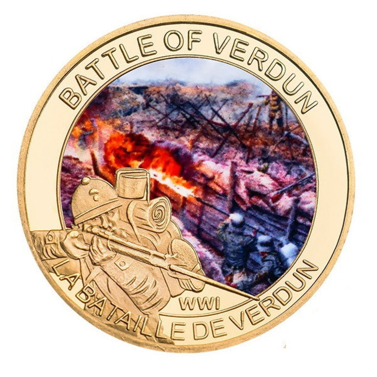 Тема: Монета присвячена Битві у разі Вердені (Battle of Verdun), одному з найбільш значущих і кровопролитних битв Першої світової війни (WWI), що відбулося між 1914 і 1918 роками.