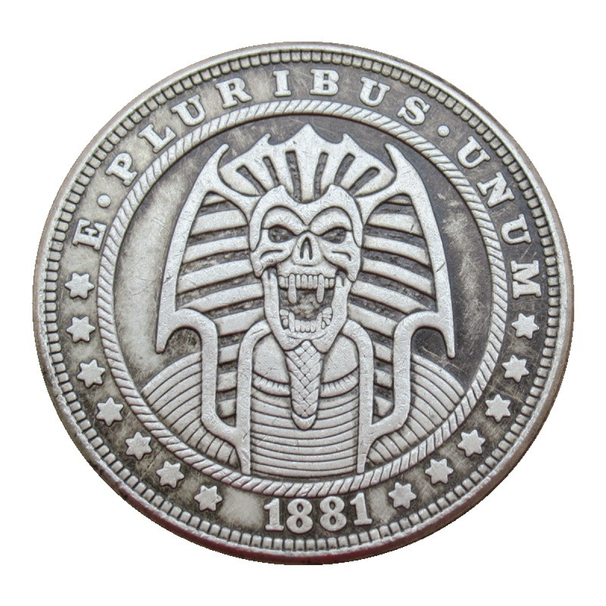 Аверс (лицьова сторона): Зображення, що схоже на бюст Marvel у традиційному головному уборі (неміс), але замість обличчя — череп з облямівкою. Навколо зображення, по верхньому краю монети, розміщений напис “E PLURIBUS UNUM“ (з багатьох — єдине), а по нижньому краю — рік “1881“. Зовнішній обідок монети прикрашений зірочками та точковим візерунком.