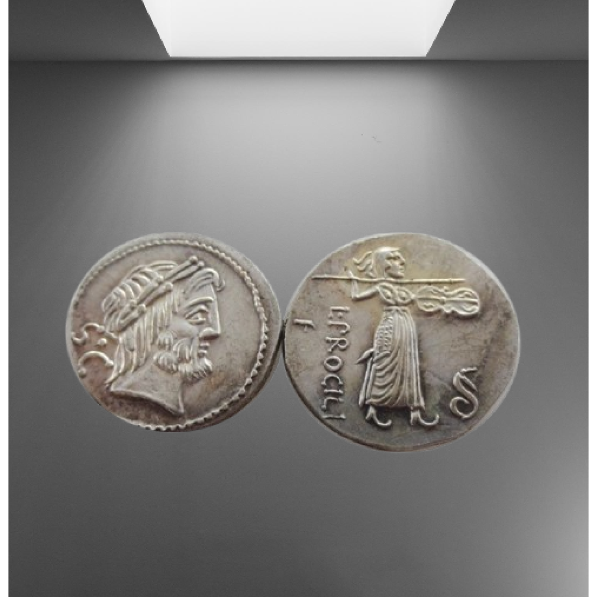Монета на зображенні — це Римський республіканський денарій, випущений Луцеєм Процилієм (L. Procilius) приблизно 80 року до нашої ери.