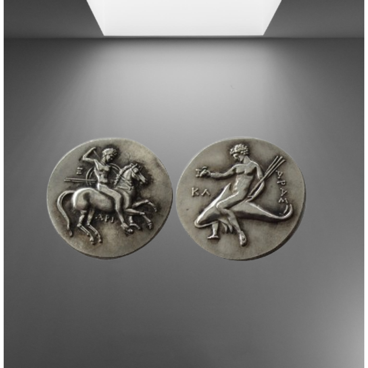 Реверс: Вигаданий людина, що сидить на дельфіні, що тримає в руках предмет, схожий на тризуб або спис, а також інший предмет у витягнутій руці. Поруч із зображенням видно букви “КА“ і “ДРА“ — що може вказувати на місце чеканки або пов“язане з ним божество, наприклад, Тараса, міфологічного засновника Тарента.