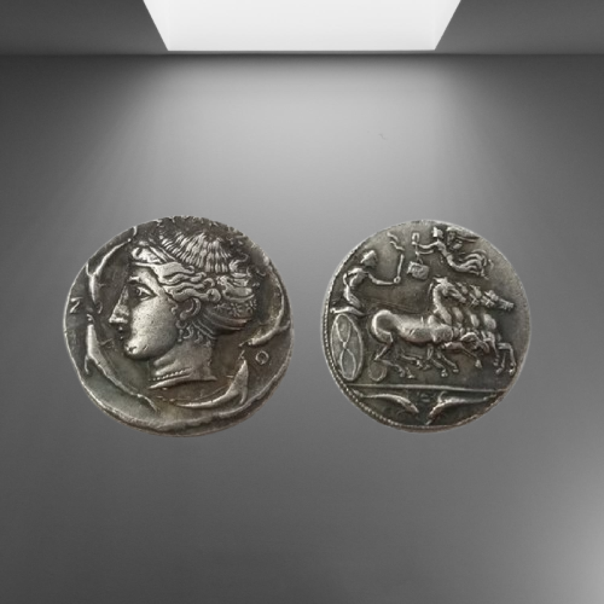 Зображена монета, імовірно, є давньогрецькою декадрахмою Сіракуз, відомою як декадрахма Аретузи.