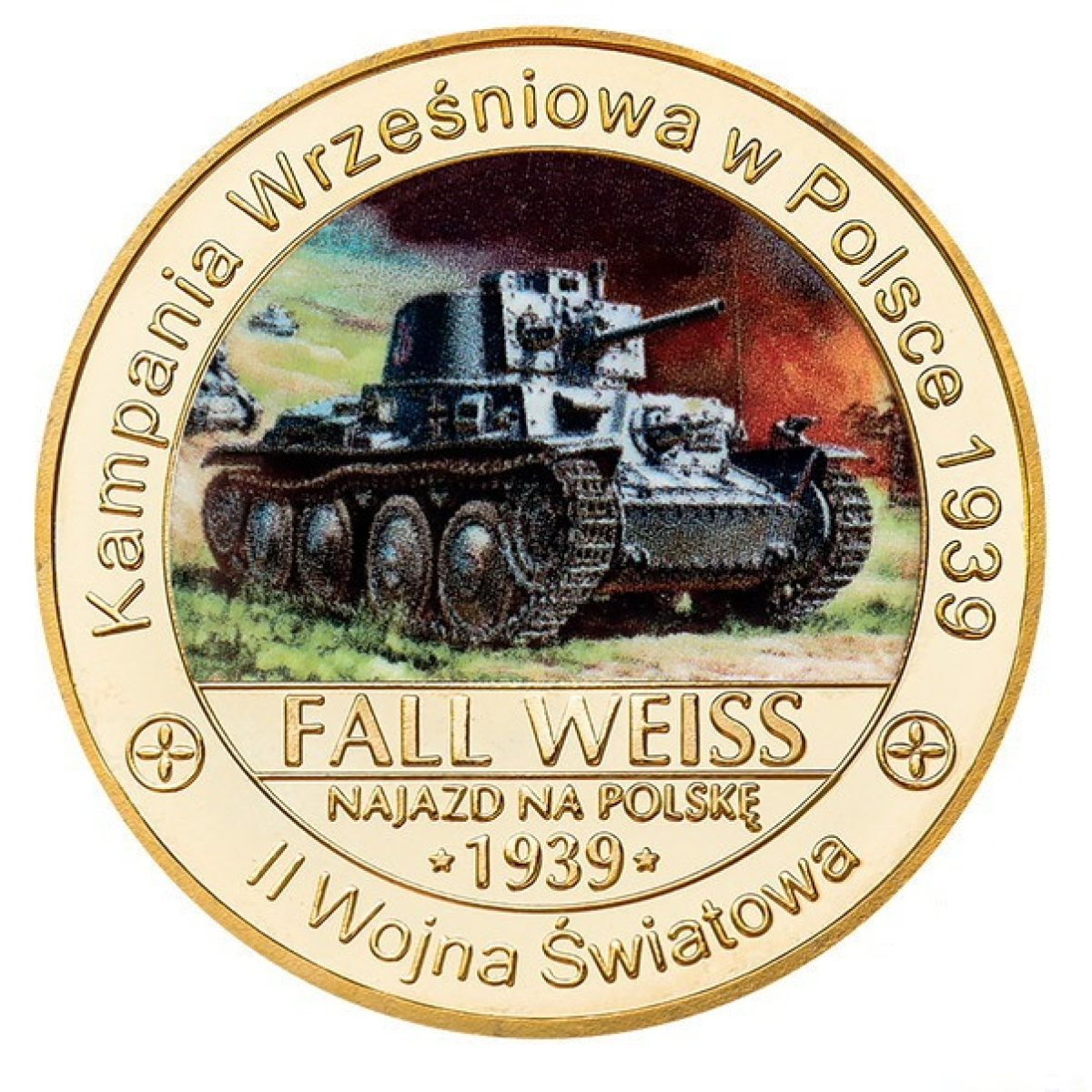На зображенні представлені пам“ятні монети, присвячені Сентябрьської кампанії 1939 року в Польщі, відомою також як План «Вайс» або Вторгнення в Польщу.
