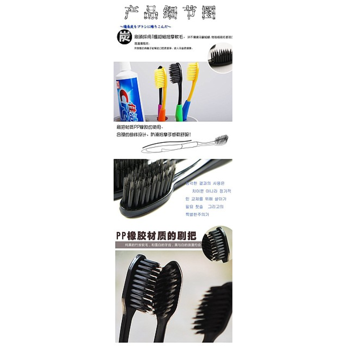 - За допомогою нанотехнології, щетини виготовлені вставляючи мікрочастинки з бамбукового вугілля 99,99% чистоти. До того ж зубна щітка має подвійну щетину, що дає змогу їй чистити навіть важкодоступні місця